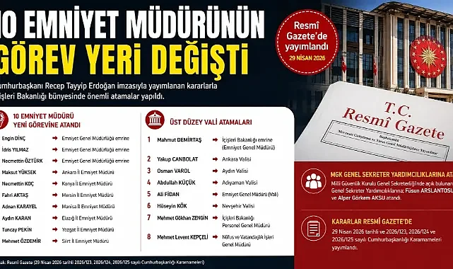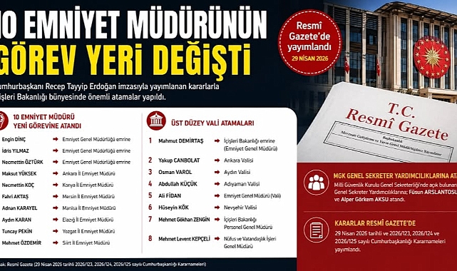 Emniyet Genel Müdürlüğünde de atamalar oldu. Ankara İl Emniyet Müdürü Engin Dinç, Mersin İl Emniyet Müdürü İdris Yılmaz ve Siirt İl Emniyet Müdürü Necmettin Öztürk, Emniyet Genel Müdürlüğü emrine atandı.